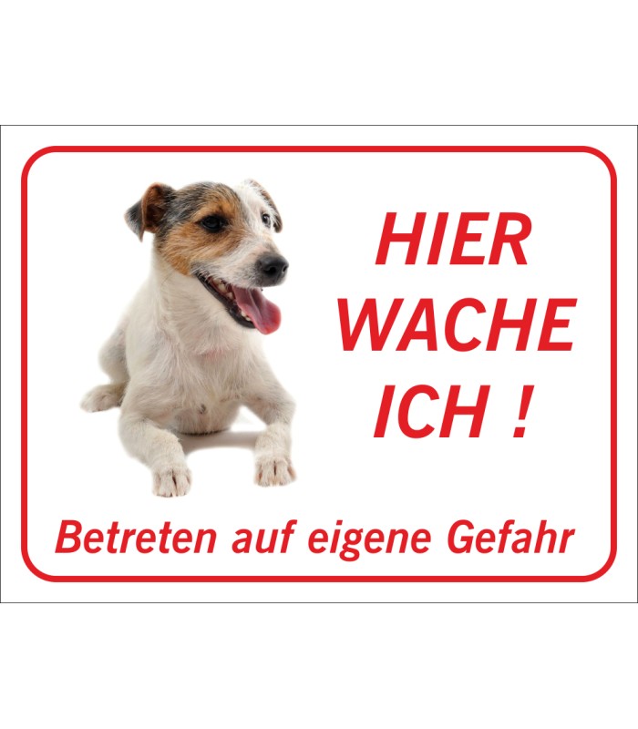 Die Jack Russell Terrier 'Hier wache ich'-Aufkleber (rot) sind in verschiedenen Größen erhältlich. Die Aufkleber sind sowohl für den Innen- wie Außeneinsatz geeignet.