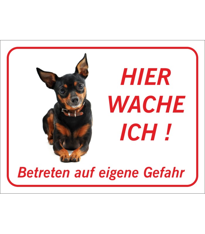Die Zwergpinscher 'Hier wache ich'-Aufkleber (rot) sind in verschiedenen Größen erhältlich. Die Aufkleber sind sowohl für den Innen- wie Außeneinsatz geeignet.