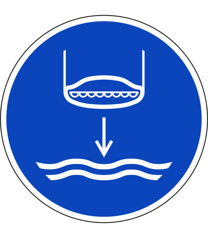 Die Aufkleber 'Rettungsboot fieren beim Aussetzvorgang' gem. ISO-7010 sind in verschiedenen Größen und auch spiegelverkehrt erhältlich.