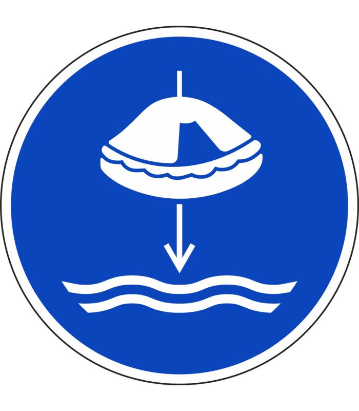 Die Aufkleber 'Rettungsfloß fieren beim Aussetzvorgang' gem. ISO-7010 sind in verschiedenen Größen und auch spiegelverkehrt erhältlich.