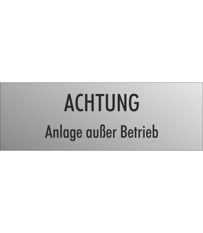 Die Schilder 'Achtung Anlage außer Betrieb' (Edelstahl Look) werden aus hochwertigem Kunststoff hergestellt und sind in verschiedenen Größen erhältlich. Die Schilder sind sowohl für den Innen- wie Außeneinsatz geeignet.