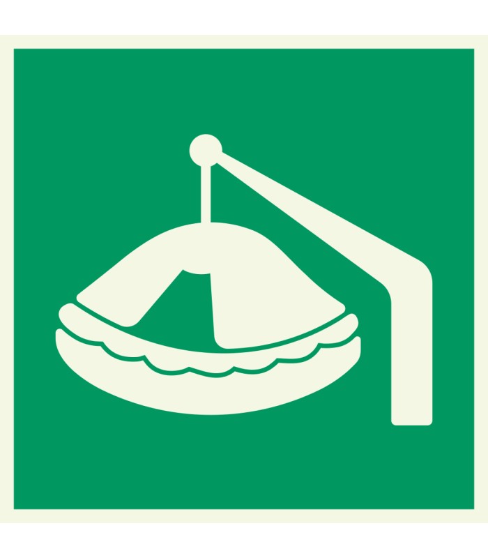 Die lumineszierenden Schilder 'Mit Davit aussetzbares Rettungsfloß' werden aus hochwertigem 2 mm dicken weißen Kunststoff hergestellt und sind in verschiedenen Größen erhältlich.