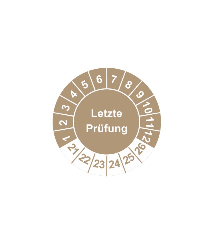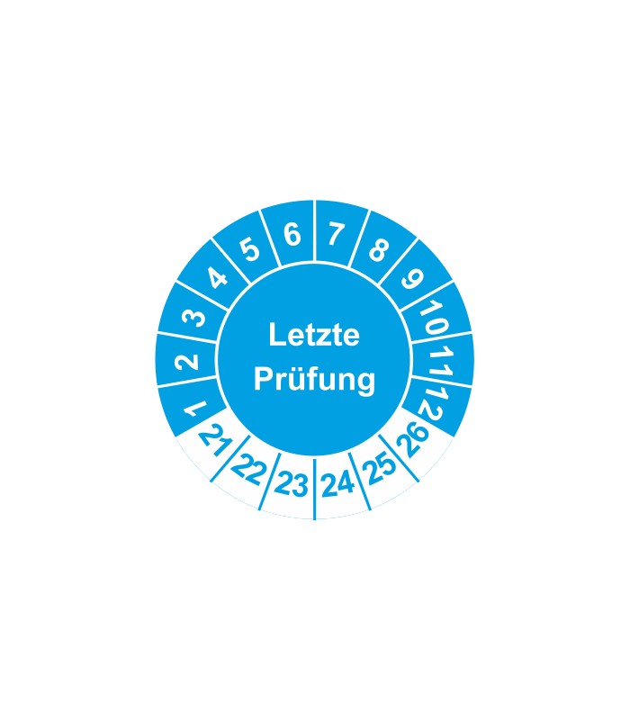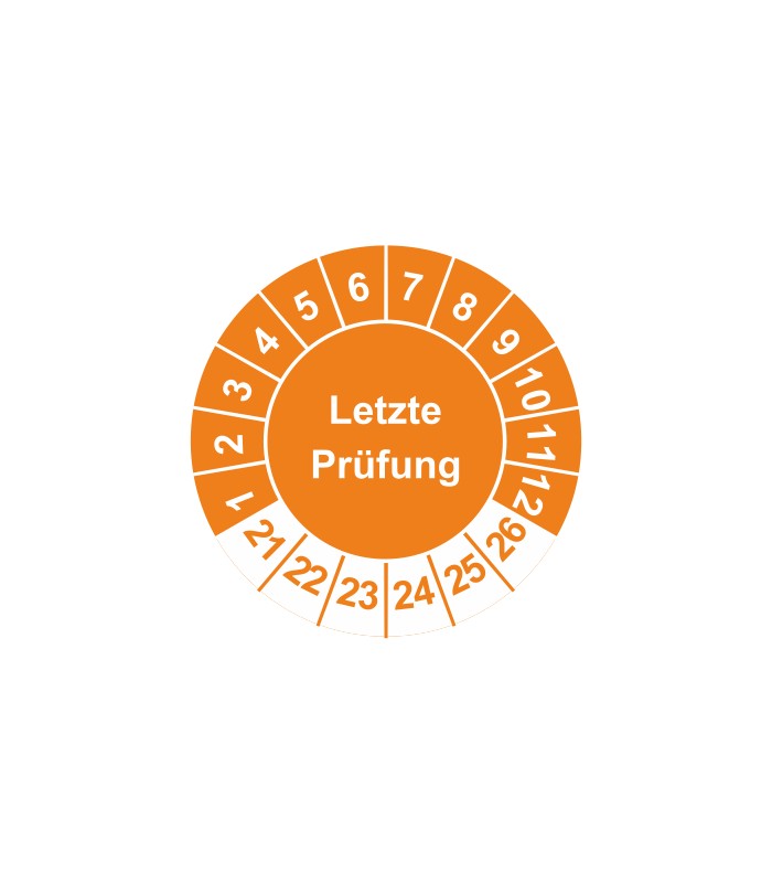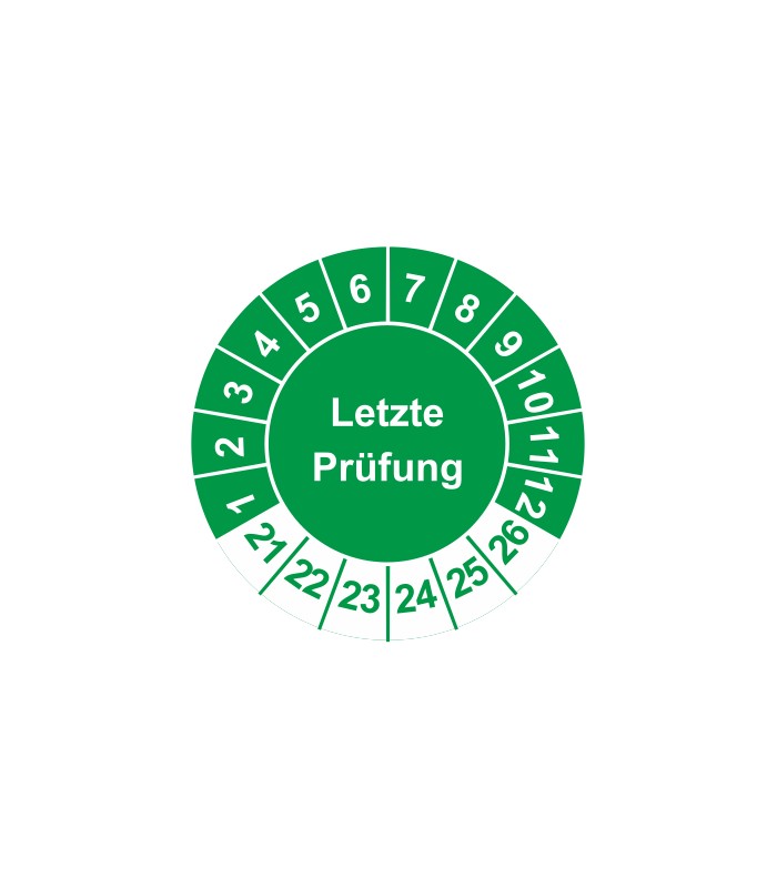 Prüfplaketten mit dem Text 'Letzte Prüfung', in verschiedene Farben und Abmessungen erhältlich.
