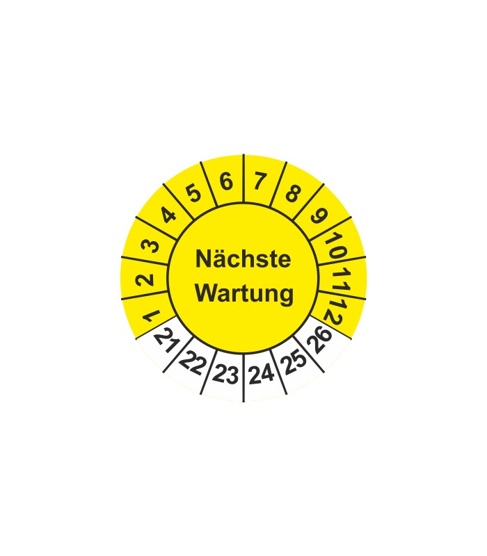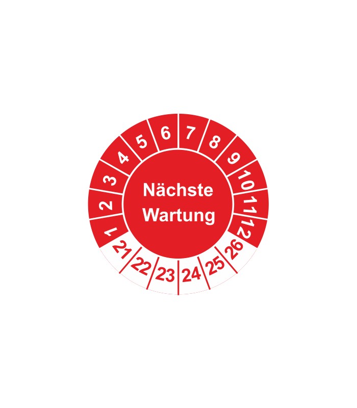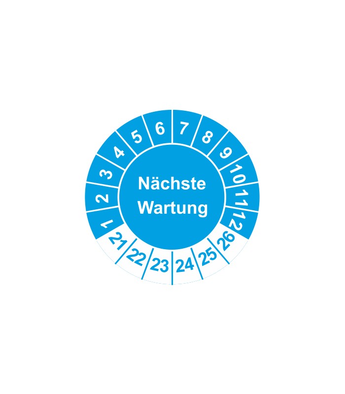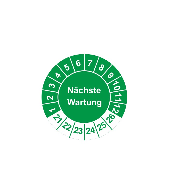 Prüfplaketten mit dem Text 'Nächste Wartung', in verschiedene Farben und Abmessungen erhältlich.