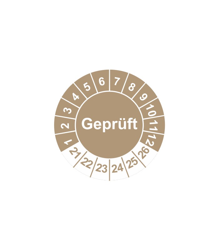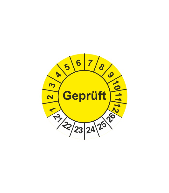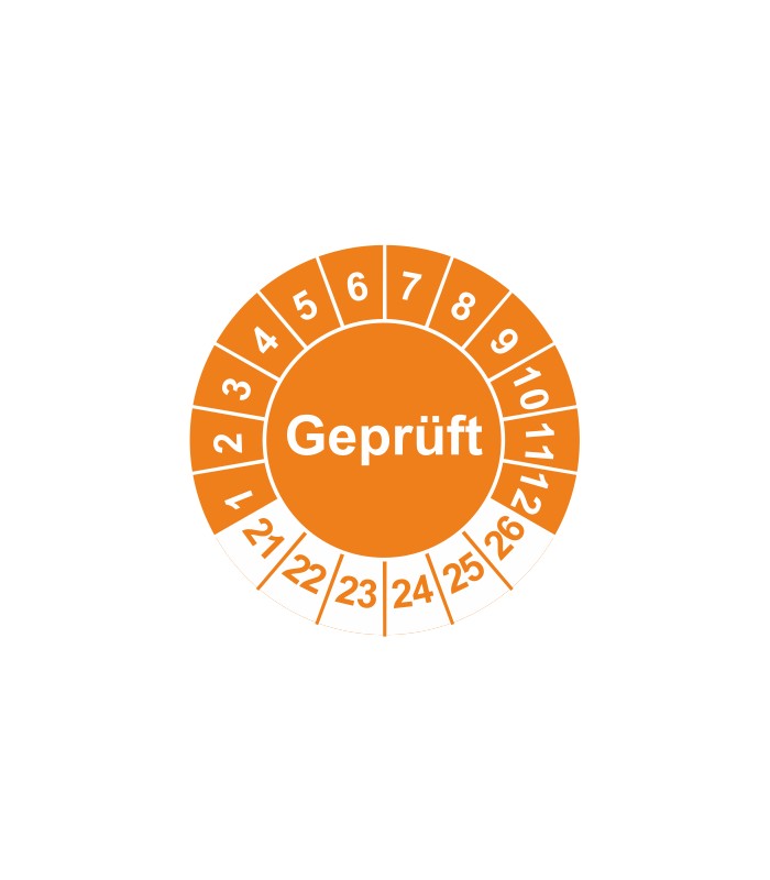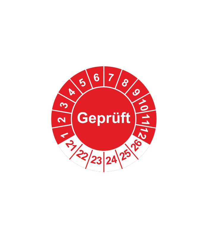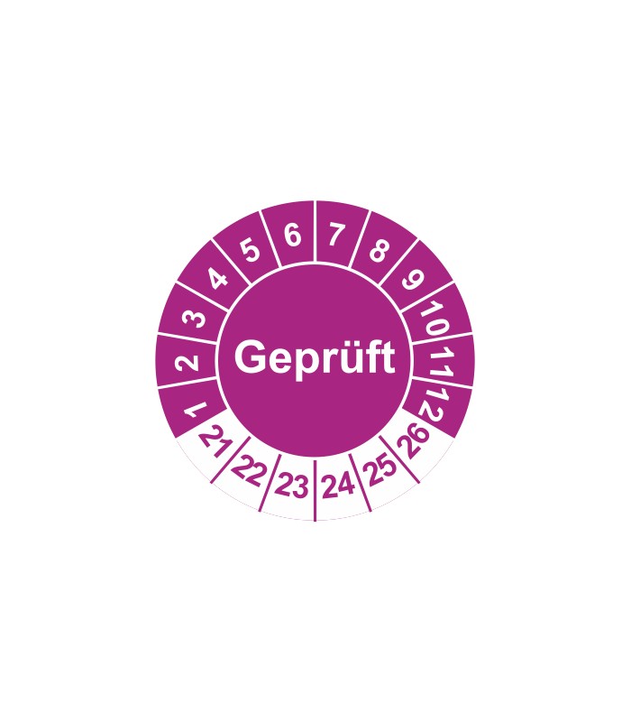Prüfplaketten mit dem Text 'Geprüft', in verschiedene Farben und Abmessungen erhältlich.