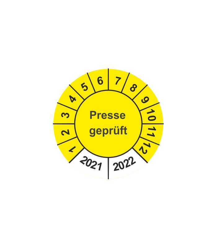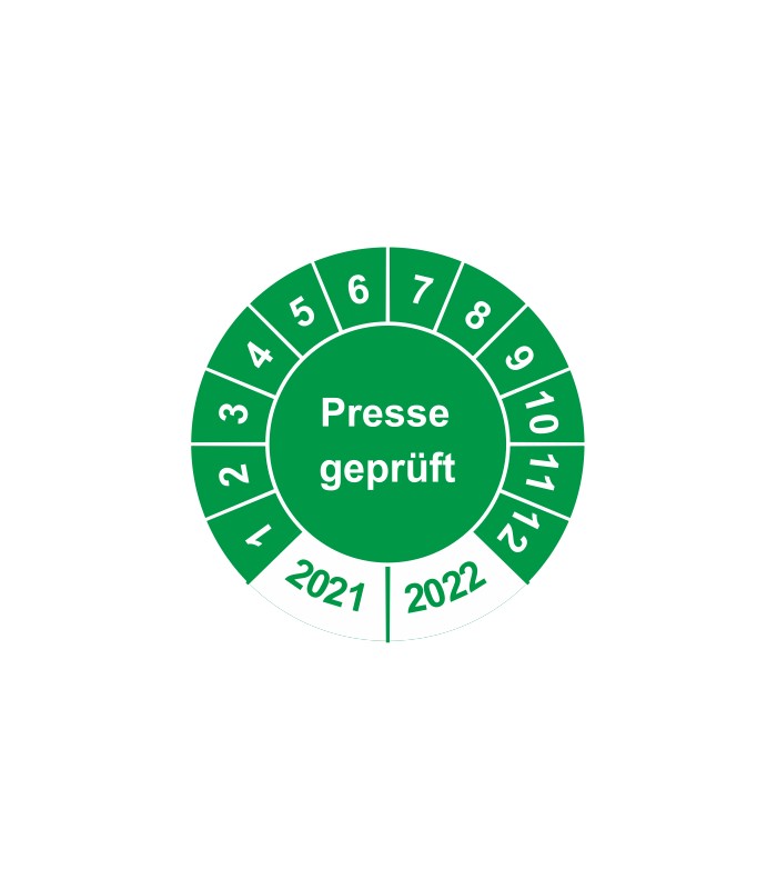 Prüfplaketten mit dem Text 'Presse geprüft', in verschiedene Farben und Abmessungen erhältlich.