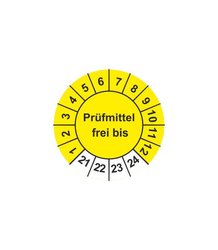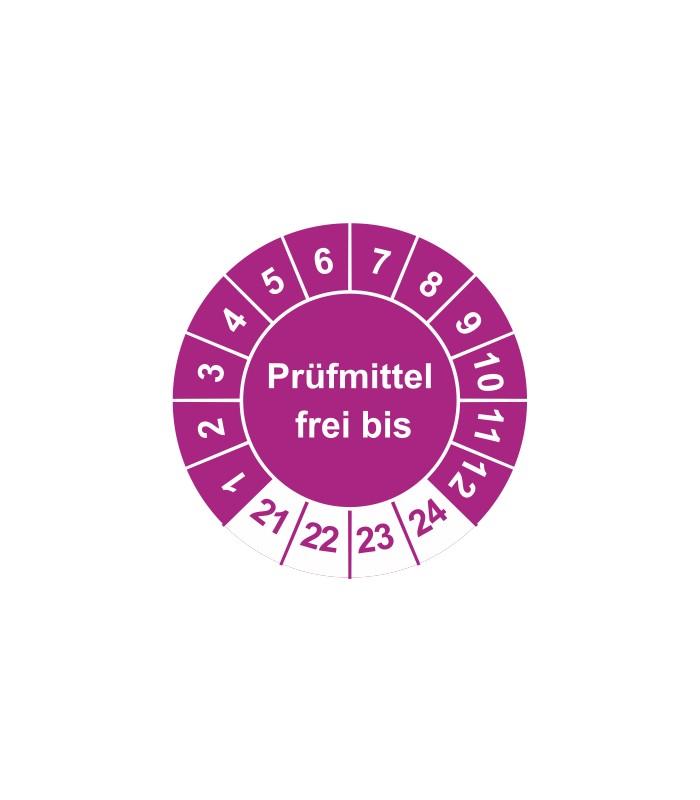 Prüfplaketten mit dem Text 'Prüfmittel frei bis', in verschiedene Farben und Abmessungen erhältlich.