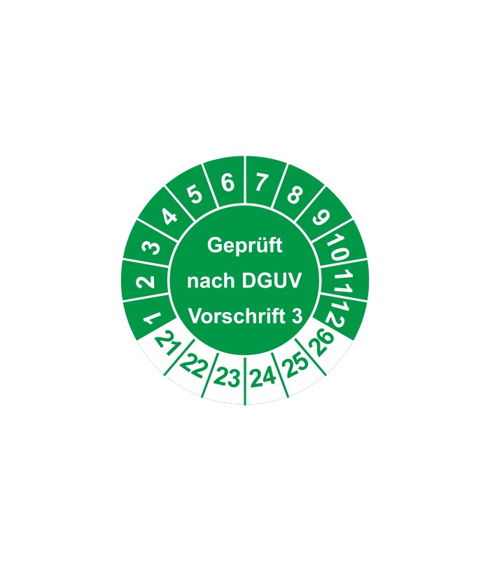 Prüfplaketten mit dem Text 'Geprüft nach DGUV Vorschrift 3', in verschiedene Farben und Abmessungen erhältlich.