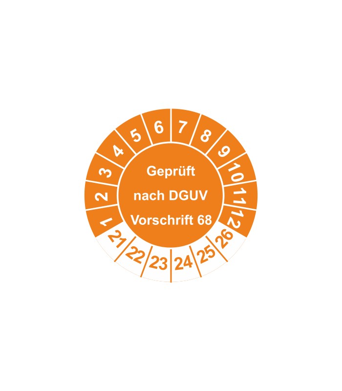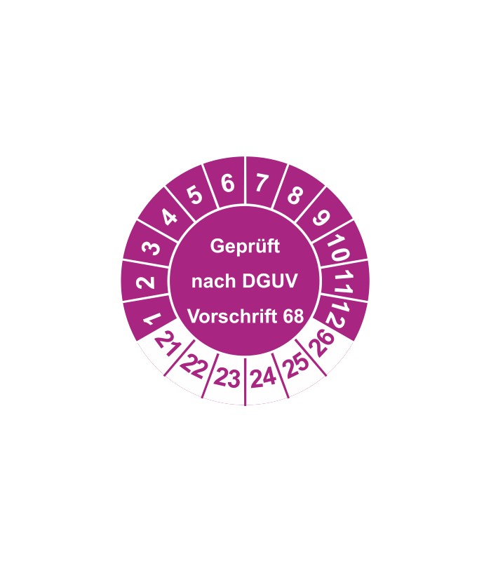 Prüfplaketten mit dem Text 'Geprüft nach DGUV Vorschrift 68', in verschiedene Farben und Abmessungen erhältlich.