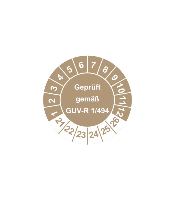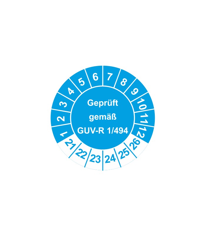 Prüfplaketten mit dem Text 'Geprüft gemäß GUV-R 1/494', in verschiedene Farben und Abmessungen erhältlich.