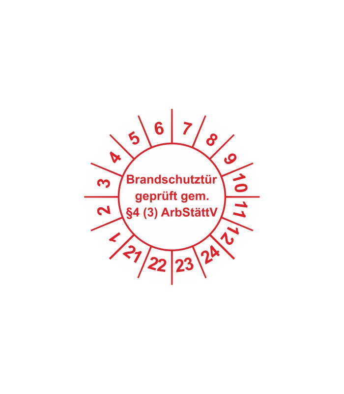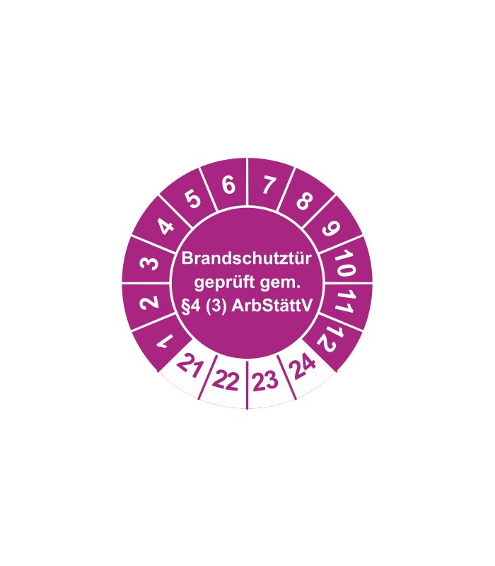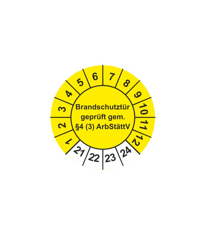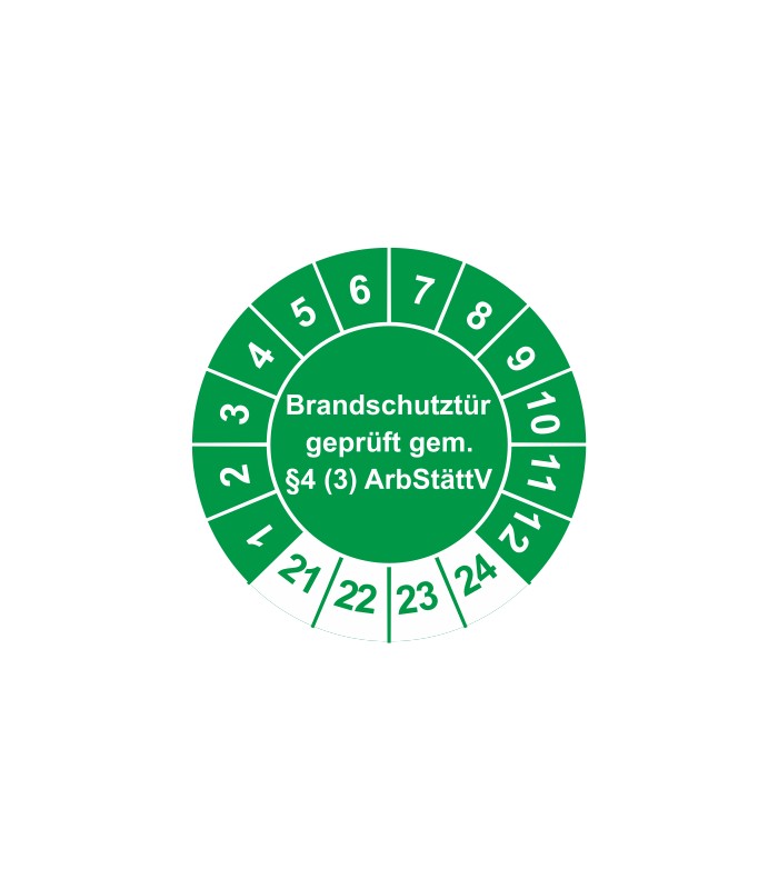 Prüfplaketten mit dem Text 'Brandschutztür geprüft gem. §4 (3) ArbStättV', in verschiedene Farben und Abmessungen erhältlich.