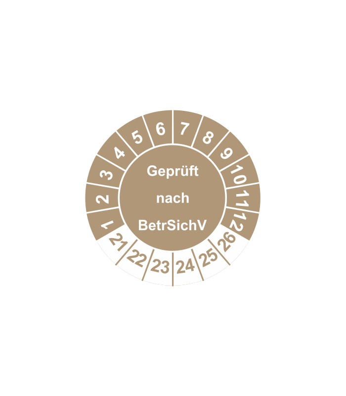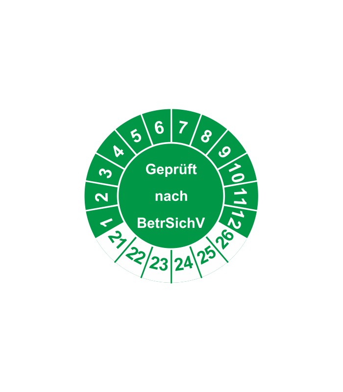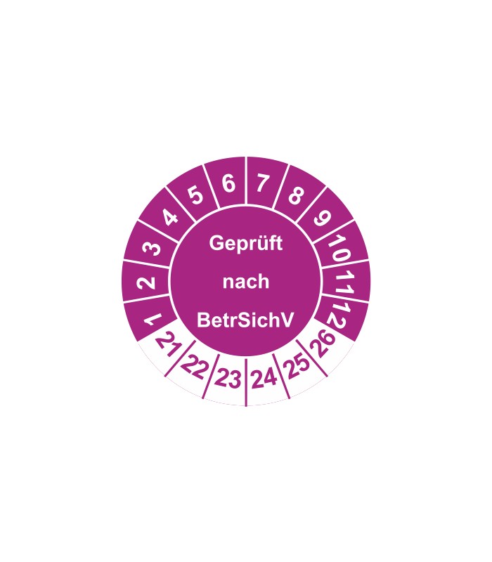 Prüfplaketten mit dem Text 'Geprüft nach BetrSichV', in verschiedene Farben und Abmessungen erhältlich.