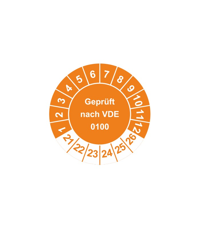 Prüfplaketten mit dem Text 'Geprüft nach VDE 0100', in verschiedene Farben und Abmessungen erhältlich.