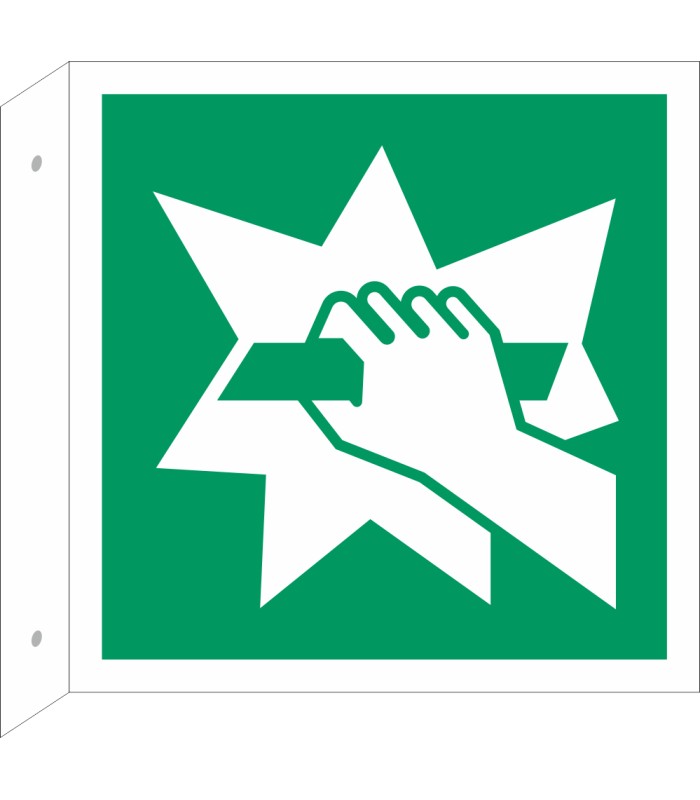 Die rechtwinkligen Schilder 'Notausgangsvorrichtung' (ISO-7010) werden aus hochwertigem weißen Kunststoff hergestellt, wobei das Symbol beidseitig sichtbar ist. Die Schilder sind in verschiedenen Größen erhältlich und sind sowohl für den Innen- wie Außeneinsatz geeignet.