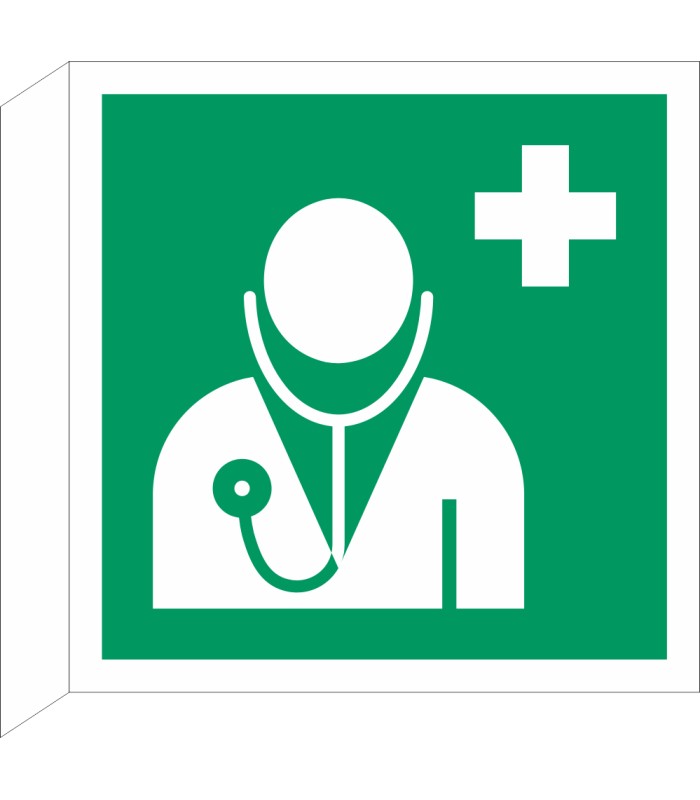 Die rechtwinkligen Schilder 'Arzt' (ISO-7010) werden aus hochwertigem weißen Kunststoff hergestellt, wobei das Symbol beidseitig sichtbar ist. Die Schilder sind in verschiedenen Größen erhältlich und sind sowohl für den Innen- wie Außeneinsatz geeignet.