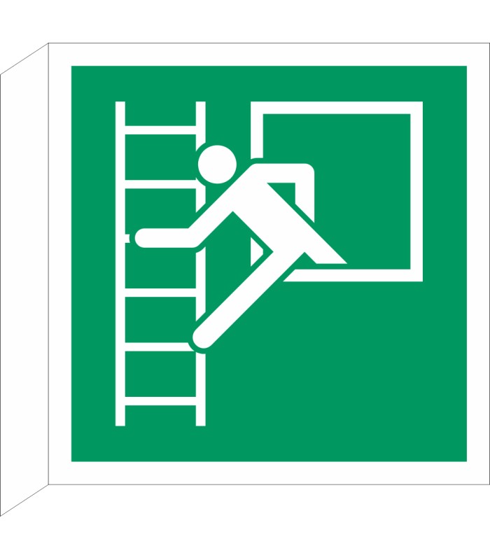Die rechtwinkligen Schilder 'Notausstieg Fluchtleiter' (ISO-7010) werden aus hochwertigem weißen Kunststoff hergestellt, wobei das Symbol beidseitig sichtbar ist. Die Schilder sind in verschiedenen Größen erhältlich und sind sowohl für den Innen- wie Außeneinsatz geeignet.