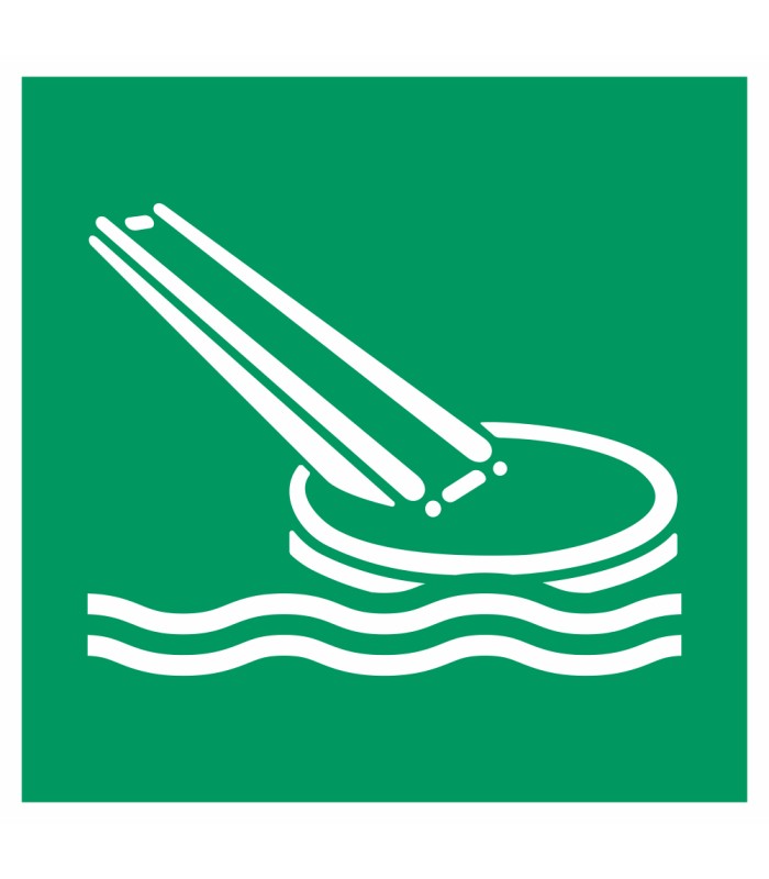 Die Aufkleber 'Offene Rutsche für Schiffsevakuierung' gem. ISO-7010 sind in verschiedenen Größen und auch spiegelverkehrt erhältlich.