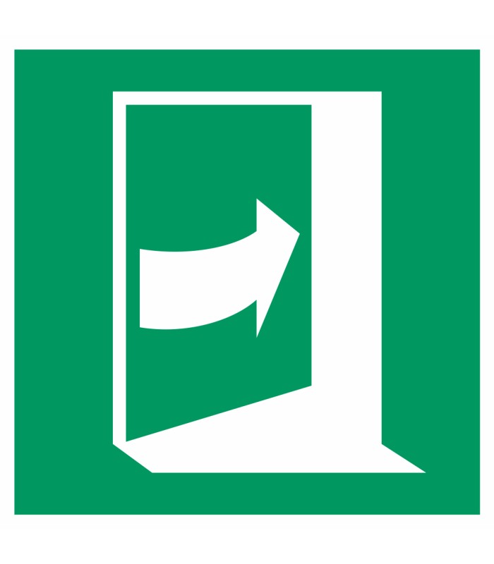 Die Aufkleber 'Tür öffnet durch Aufdrücken auf der linken Seite' gem. ISO-7010 sind in verschiedenen Größen und auch spiegelverkehrt erhältlich.
