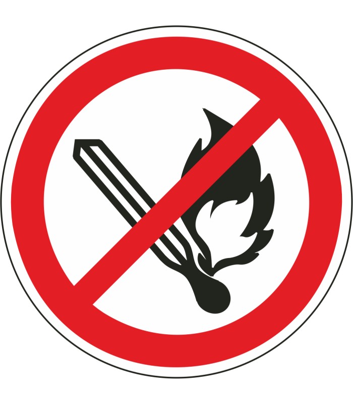 Die Aufkleber 'Keine offene Flamme; Feuer, offene Zündquelle und Rauchen verboten' gem. ISO-7010 sind in verschiedenen Größen und auch spiegelverkehrt erhältlich.