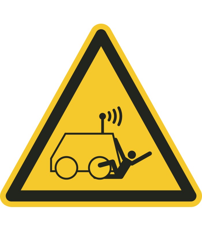 Die Schilder 'Warnung Gefahr des Überfahrens durch ferngesteuerte Maschinen' gem. ISO-7010 werden aus hochwertigem weißem Kunststoff hergestellt und sind in unterschiedlichen Größen erhältlich.