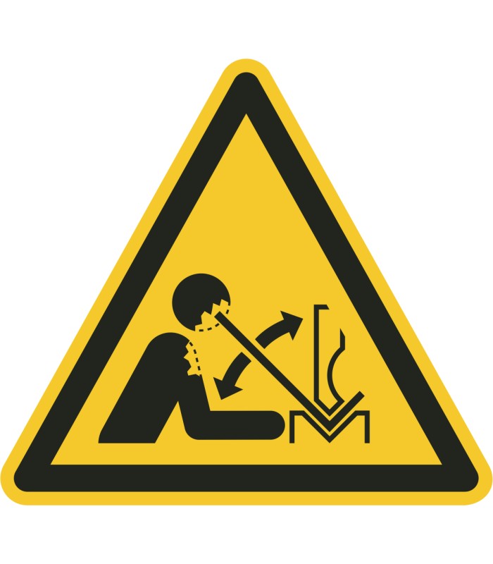 Die Aufkleber 'Warnung vor schnell beweglichem Werkstück in der Abkantpresse' gem. ISO-7010 sind in verschiedenen Größen und auch spiegelverkehrt erhältlich.